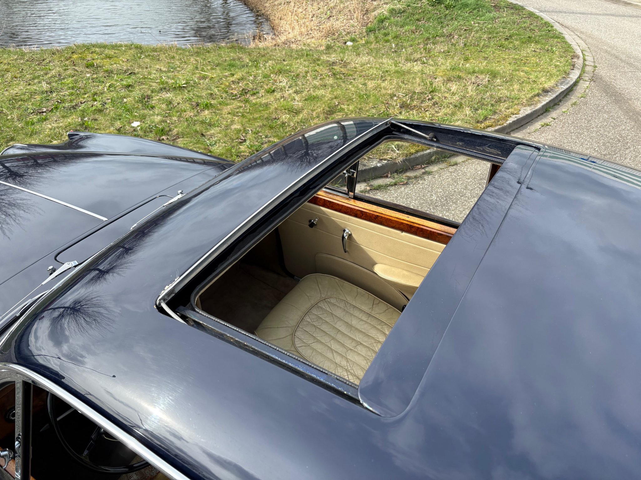 Donker blauw met een beige interieur.
