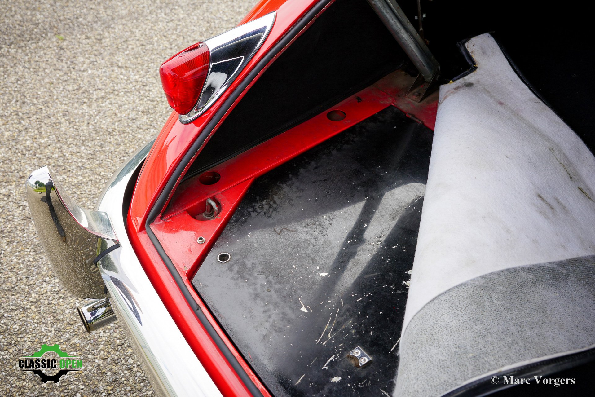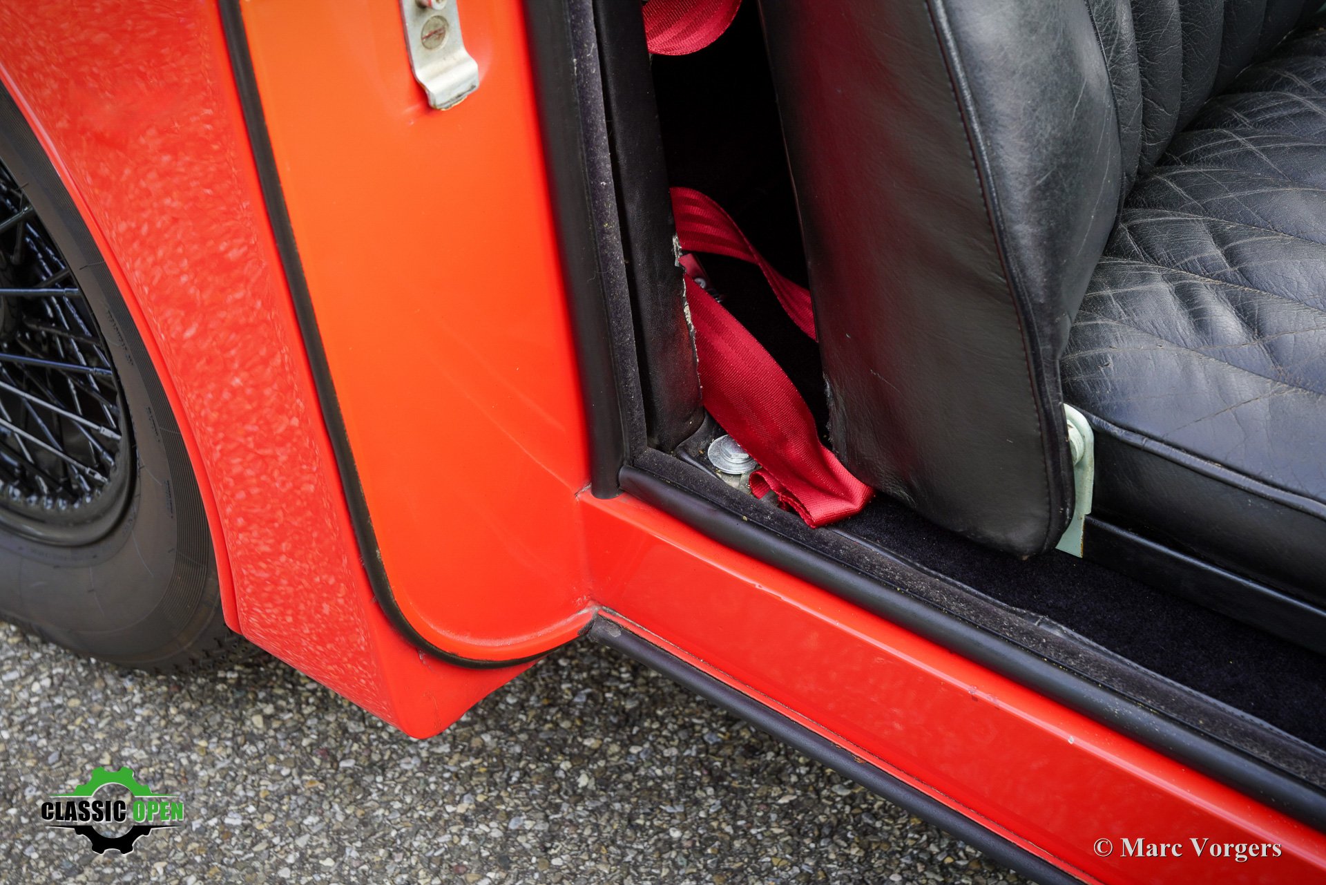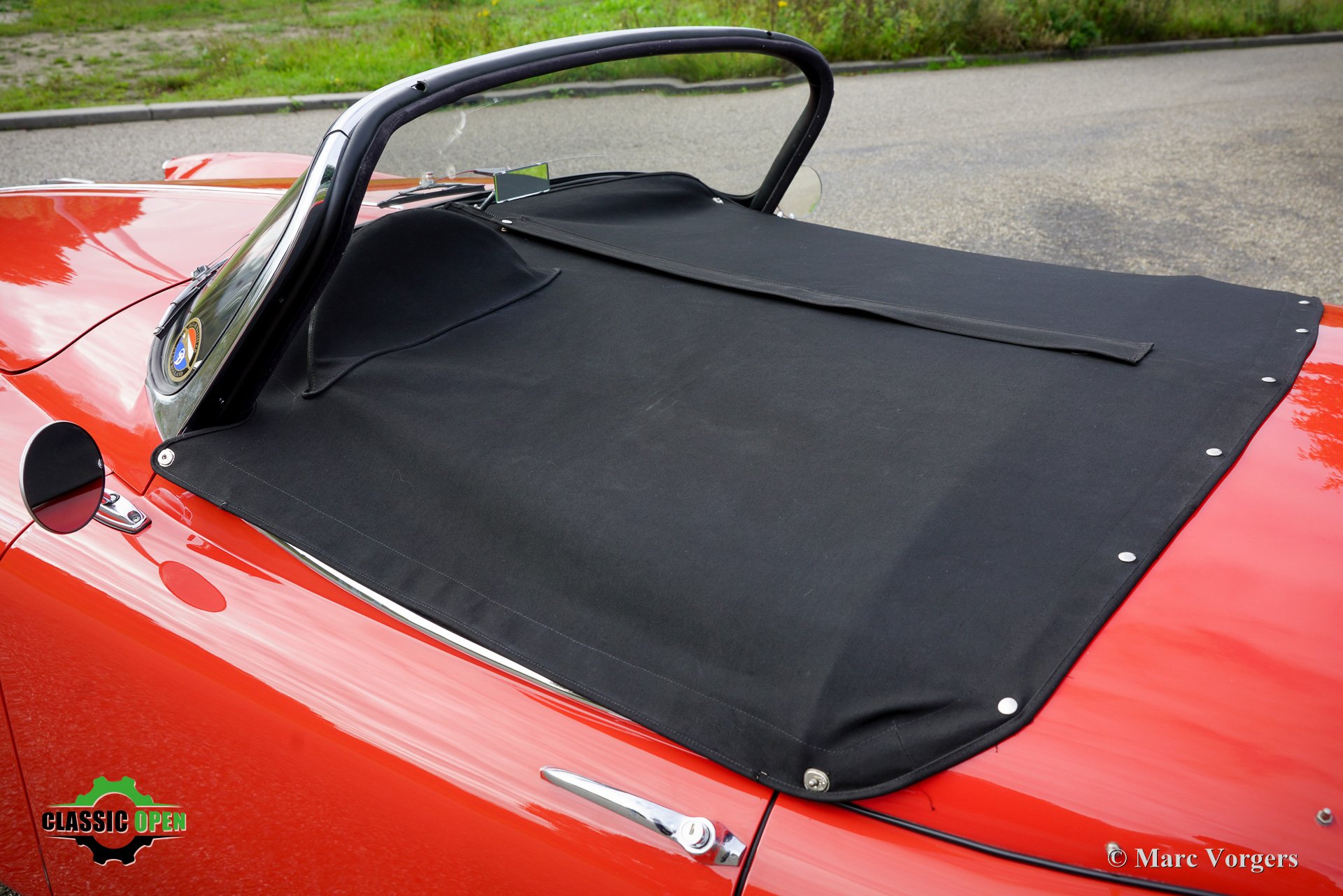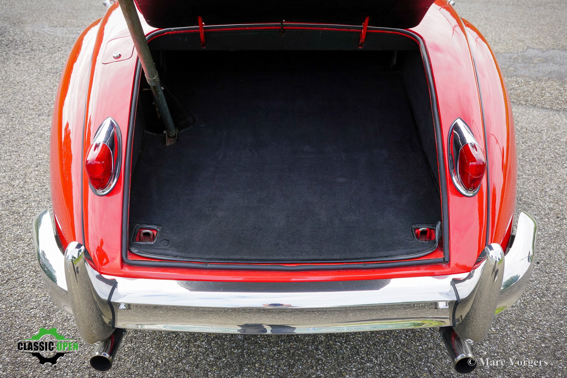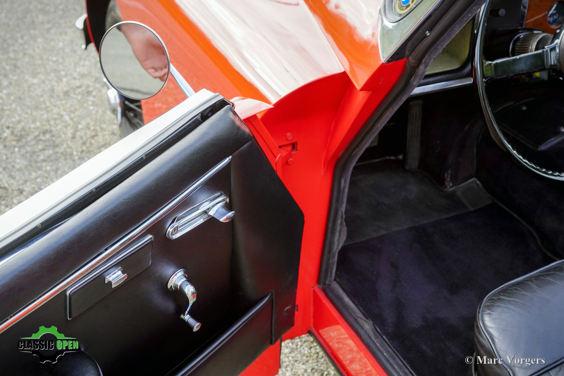 Farbe rot (Carmen red) kombiniert mit einer schwarzen Lederausstattung mit schwarzem Teppich. Schwarzes Verdeck und Persenning.