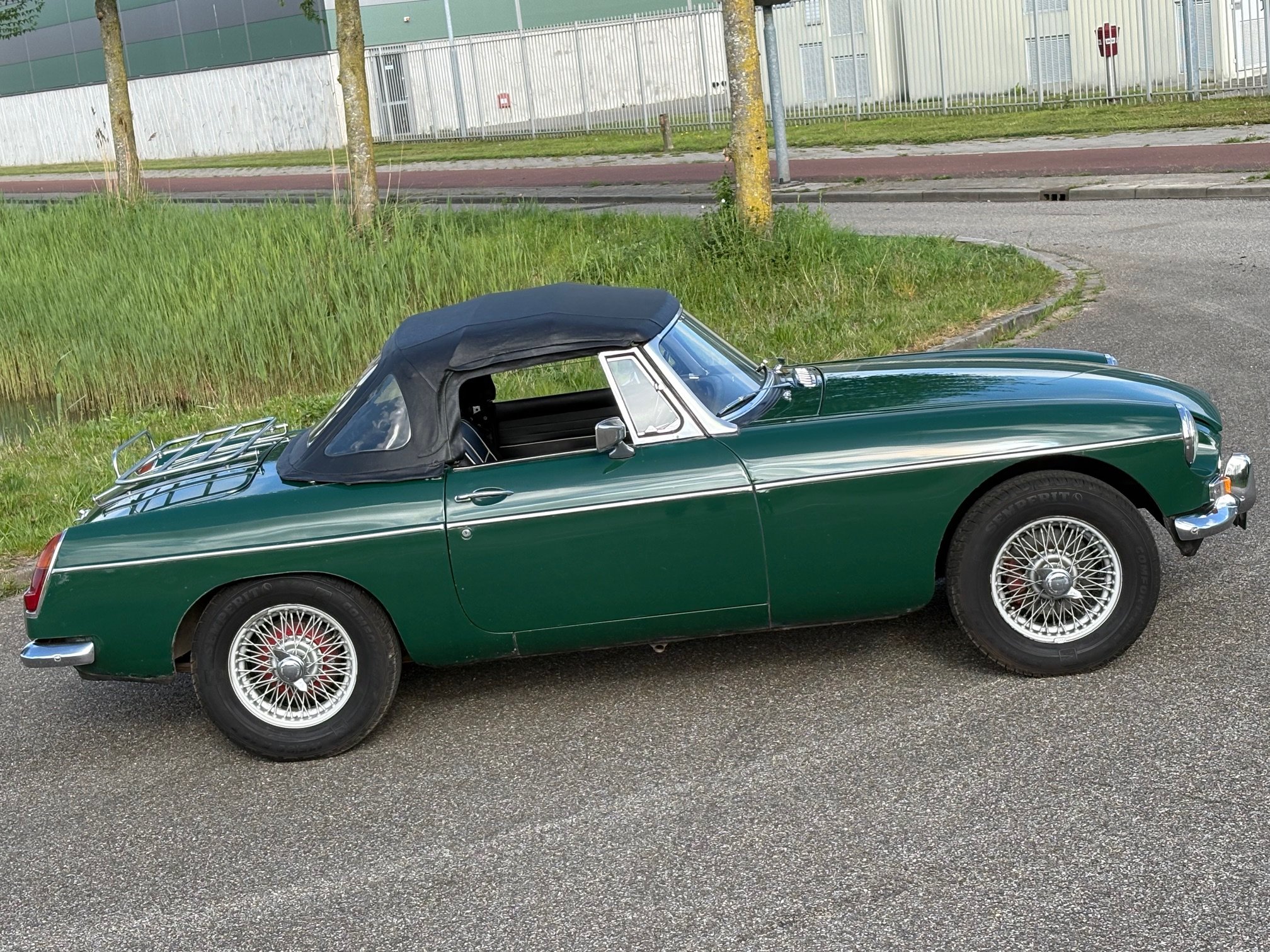 British Racing Green mit schwarzer Innenausstattung und schwarzem Verdeck.